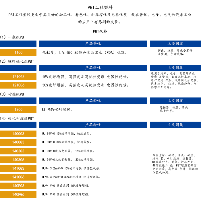 增強(qiáng)級(jí)1210G3 | 15%玻纖增強(qiáng),高強(qiáng)度及高抗熱變形電器性能佳。 | 適用于汽車(chē)、電子、電器等產(chǎn)業(yè)精密注塑用,如日光燈基座、省電燈泡用燈座、汽車(chē)之分電盤(pán)、汽車(chē)把手、燈座、風(fēng)扇外均、電器零件開(kāi)關(guān)等。 |