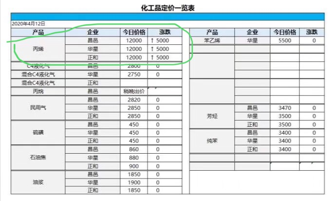 暴漲的聚丙烯粉料深深刺痛了丙烯工廠的心,周日丙烯也漲5000元/噸。山東丙烯市場(chǎng)主流價(jià)格從4月10日的5900-6000元/噸的價(jià)格一路暴漲至4月12日的8000元/噸,價(jià)差高達(dá)2050元/噸,漲幅34.5%?!?月12日,山東昌邑石化有限公司等丙烯最新報(bào)價(jià)暴漲,漲5000元/噸至12000元/噸。