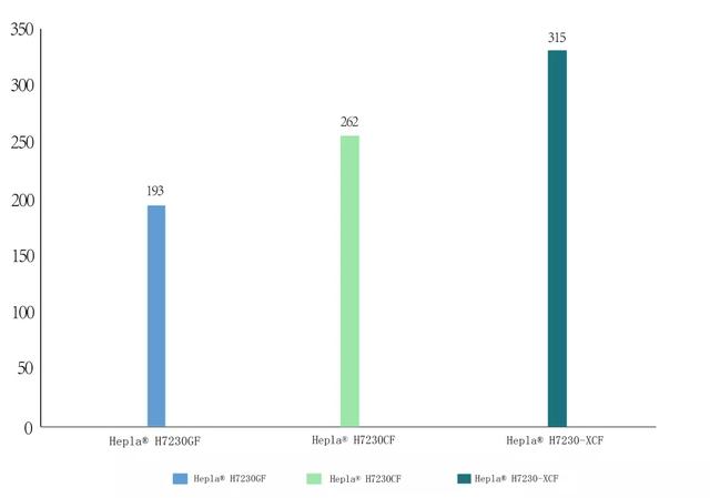 下圖為Hepla? H7230-XCF(30%碳纖維)與Hepla? H7230CF (30%碳纖維)、Hepla? H7230GF(30%玻璃纖維)的拉伸強(qiáng)度對照圖。