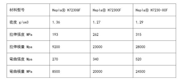 該產(chǎn)品具有優(yōu)異的機(jī)械強(qiáng)度與抗沖擊能力,尺寸穩(wěn)定性高、翹曲低,材料性能較進(jìn)口產(chǎn)品提升30%。以高溫尼龍為基材的Hepla? H9000-XCF系列碳纖維復(fù)合材料,彎曲剛度超過52GPa,彎曲強(qiáng)度高達(dá)520MPa,拉伸強(qiáng)度達(dá)到360MPa;以PA66為基材的Hepla? H7200-XCF系列拉伸強(qiáng)度達(dá)到315MPa。 采用新產(chǎn)品生產(chǎn)的零部件比鋼制零部件輕75%,比鋁合金部件輕40%,可替代大部分金屬,從而為汽車輕量化及其它行業(yè)“以塑代鋼”提供更好的解決方案。