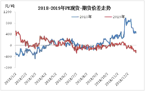 ????????2019年中國PE期現(xiàn)基差范圍較2018年縮窄,以華北煤化工7042價格與LL主力合約結(jié)算價基差來看,全年升貼水范圍在520元/噸以內(nèi),且基差多處于正值。2019年中國PE市場供需壓力加大,7-9月,中美貿(mào)易摩擦升級,市場擔憂情緒加重,現(xiàn)貨價格弱勢下行,并跌破十年歷史低位,此階段現(xiàn)貨端壓力大于期貨,基差處于負值。