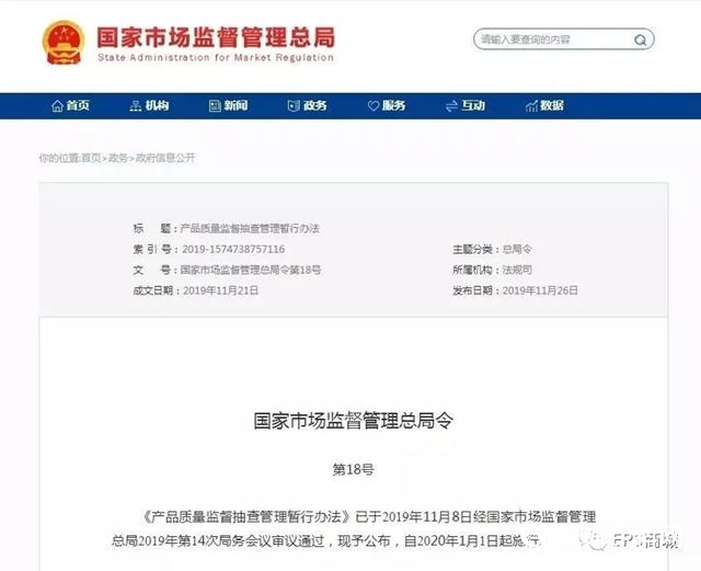 ????????11月26日,國家市場監(jiān)督管理總局發(fā)布《產(chǎn)品質(zhì)量監(jiān)督抽查管理暫行辦法》,將自2020年1月1日起施行?!掇k法》共56條,明確了監(jiān)督抽查的組織、抽樣、檢驗(yàn)、異議處理、結(jié)果處理及相關(guān)人員應(yīng)承擔(dān)的法律責(zé)任,對于加強(qiáng)產(chǎn)品質(zhì)量監(jiān)督管理、規(guī)范產(chǎn)品質(zhì)量監(jiān)督抽查工作、保護(hù)消費(fèi)者的合法權(quán)益有重要意義。