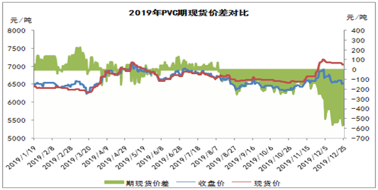 ????????近日,受市場供應(yīng)面有一定提升以及下游接貨不佳影響,PVC行情轉(zhuǎn)入跌勢。PVC期貨偏弱震蕩,對現(xiàn)貨市場價格形成一定打壓,市場價格承壓下跌。此外,期現(xiàn)貨價差再創(chuàng)新高,最高達(dá)570元/噸左右。由上圖可以看出,進(jìn)入2019年四季度,PVC期限價差逐漸擴(kuò)大,基本維持在500-600元/噸之間,而期貨價格遠(yuǎn)遠(yuǎn)低于現(xiàn)貨價格,超出正常范圍。因此單從期現(xiàn)價差方面看,后期將逐漸修復(fù)步入正軌,現(xiàn)貨大幅下降的可能性偏大。