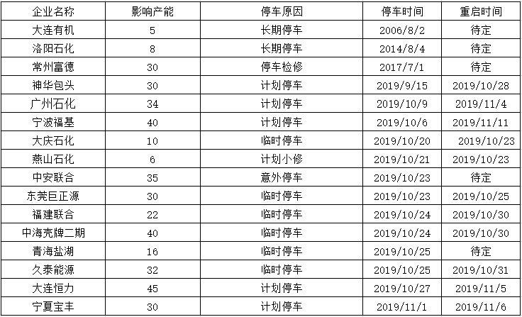 ????????10月份國內聚丙烯檢修裝置較上月明顯減少。本月檢修損失量21萬噸。月內裝置臨時停車較多,久泰能源、燕山石化、大慶石化、中安聯(lián)合、東莞巨正源、福建聯(lián)合二線、中海殼、久泰能源等裝置短期停車,多數已經重啟。前期計劃檢修裝置延安煉廠、陜西延安能源、神華包頭、寧波臺塑等裝置月內已重啟。目前廣州石化一、三線、東華能源(寧波)裝置處于停車狀態(tài),預計11月初重啟。后期寧夏寶豐存檢修計劃,整體供應壓力較大。