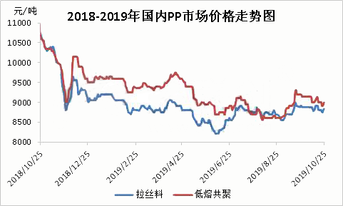 ????????2019年全年來看,國內聚丙烯市場表現不盡人意,雖然進入了傳統(tǒng)旺季,10月份國內聚丙烯市場價格小幅反彈后弱勢下行。國慶節(jié)后歸來庫存積累至高位,兩油小幅下調出廠價格,以降低庫存壓力;月中旬受國際原油走高、中美貿易局勢緩和等消息提振,PP期貨推漲下,市場價格反彈。后續(xù)隨著期貨連續(xù)走低,石化出廠價格轉跌,下游企業(yè)謹慎觀望,市場成交乏力,商家紛紛讓利促成交。臨近月底,隨著兩油庫存緩慢下降,石化出廠價止跌企穩(wěn)。月內拉絲主流價格在8700-9000元/噸。