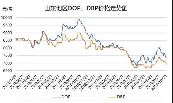 ????????如上圖所示,國內(nèi)DOP、DBP價格亦是不斷下行。就DOP而言,行業(yè)供應(yīng)充足,去庫存阻力重重,為減緩出貨阻力,市場低價不斷增加,疊加原料辛醇及苯酐跌勢,偏空情緒維持,愈跌愈不買跌始終貫穿。但跌至目前價位:山東7300-7500元/噸自提,江蘇7500元/噸自提,華南7800-7900元/噸送到,加之辛醇尚未有新低價出現(xiàn),帶動一定維價,今日走勢呈現(xiàn)平穩(wěn),雖然接近心理價位,但缺乏實(shí)質(zhì)利好基礎(chǔ)上,仍多謹(jǐn)慎。就DBP而言,行業(yè)整體開工負(fù)荷不高,庫存壓力不大,且原料丁醇及萘系苯酐,一走勢基本平穩(wěn),一走勢破位下行,導(dǎo)致市場雖然下行,但波動基本窄幅度。