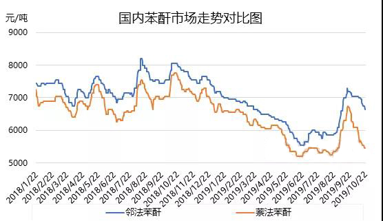 ????????如上圖所示,為鄰法苯酐與萘法苯酐走勢圖,鄰法苯酐與萘法苯酐皆是下行,其中萘系苯酐跌勢快速,前期漲幅盡數(shù)回吐,且苯酐行業(yè)跌勢恐將延續(xù)。萘系苯酐破位下行,跌勢過程中,多次引發(fā)觸底情緒,但皆以失敗告終,原料工業(yè)萘讓利下行,但跌勢節(jié)奏遠(yuǎn)不及萘系苯酐,故虧損情況依舊明顯,截止今日,山西潞寶及山西金源工業(yè)萘招標(biāo)皆是流拍,對市場利空打壓維持。伴隨萘系苯酐大跌及鄰法苯酐陰跌,鄰萘法苯酐創(chuàng)的最大價差,超1000元/噸價差,過大價差對鄰法苯酐利空沖擊明顯。在下游DOP及相關(guān)萘系苯酐跌勢打壓下,鄰法苯酐亦是不斷下探,部分倒掛現(xiàn)象出現(xiàn),故對中石化鄰苯仍有下調(diào)預(yù)期??傮w而言,苯酐行業(yè)探底走勢仍將持續(xù)。