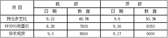 ????????第二、7月以來多空比曲線下行過程中,PP期現(xiàn)價格并不同步,多空比形成階段性底部和頂部相對領先,在50%臨界線之下,多單逐步增加,多空比逐步提升,此時配合基本面情況,有擇機介入短多的機會。多空比在8月22日達到階段性底部48.5%,之后開始一波反彈,多空比的底部領先期現(xiàn)價格一周左右時間,8月28日PP2001收盤7833元/噸,華東現(xiàn)貨在9月3日8600元/噸,相繼形成底部;9月6日,持倉多空比50.3%形成階段性頂部,且50%臨界線之上僅僅維持兩天就再次轉頭下行,此次多空比領先了期現(xiàn)價格10天左右??傊敹嗫毡?、期貨和現(xiàn)貨價格同向而行,“共振”之際,方可順勢而為。
