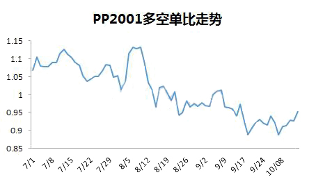 ????????放長時間看,自從2019年3月底到4月底,PP2001持倉多空比一直在50%臨界線之下,4月底到8月中旬,多空比在50%臨界線之上震蕩,8月中旬到目前在50%臨界線之下。跟基本面走勢并不吻合。當多空比與期現(xiàn)價格走勢產(chǎn)生背離時候,要提高警惕,分析原因并判斷真實方向。PP2001合約在9月份換為主力合約,太長時間的參考意義不大。