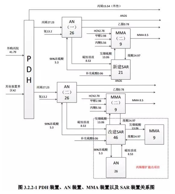 丙烷脫氫(PDH)、丙烯腈(AN)裝置、甲基丙烯酸甲酯(MMA)裝置以及廢酸回收(SAR)裝置之間關(guān)系圖:
