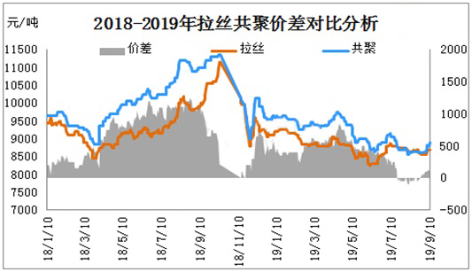 ????????2018-2019年P(guān)P拉絲、共聚在7-8月處于僵持低迷狀態(tài),業(yè)者對(duì)長期成交疲態(tài)市場(chǎng)看空情緒明顯加重。商家因擔(dān)憂后市,低價(jià)甩貨明顯增多。9月市場(chǎng)受兩油庫存快速消耗及期貨連漲支撐,市場(chǎng)呈現(xiàn)絕地反彈局勢(shì),拉絲與共聚價(jià)差逐步拉開距離。目前拉絲與共聚價(jià)差已經(jīng)由原來持平狀態(tài),擴(kuò)大至100-200元/噸。根據(jù)目前拉絲與共聚成本價(jià)差計(jì)算,共聚高于拉絲300-400元/噸屬于正常價(jià)差,拉絲與共聚有價(jià)差有進(jìn)一步擴(kuò)大趨勢(shì)。