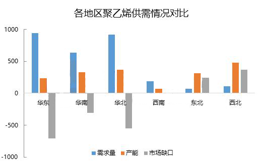 ????????近年國內(nèi)產(chǎn)能的不斷增加,各地區(qū)供需情況也有所改變。東北地區(qū)是我國老工業(yè)基地,是中油系統(tǒng)裝置集中地區(qū),東北地區(qū)下游需求占國內(nèi)需求占比較小,是國內(nèi)PE產(chǎn)品輸出型地區(qū)。另外,西北地區(qū)依托豐富的煤炭資源,近年煤制裝置搞通文化路,西北地區(qū)產(chǎn)能快速增長。西北地區(qū)同東北地區(qū)一樣,產(chǎn)能分布集中,但下游需求較少,也是我國主要的PE產(chǎn)品輸出地。國內(nèi)主要的下游需求地區(qū)為華東地區(qū)、華南地區(qū)和華北地區(qū)。其中,最大的消費(fèi)地區(qū)為華東地區(qū),華東地區(qū)聚乙烯消費(fèi)點(diǎn)全國總消費(fèi)量的三分之一左右,但華東地區(qū)當(dāng)?shù)負(fù)碛械漠a(chǎn)能有限,占全國總產(chǎn)能的13%。華東地區(qū)年P(guān)E消費(fèi)量在900萬噸以上,進(jìn)口產(chǎn)品充斥華東市場(chǎng)。華東區(qū)域是PE產(chǎn)品最大的凈流入地區(qū),隨著國際與國內(nèi)的快速擴(kuò)能,華東地區(qū)是進(jìn)口產(chǎn)品與國產(chǎn)產(chǎn)品必爭之地,價(jià)格競(jìng)爭也將進(jìn)入白熱化狀態(tài),未來華東地區(qū)很可能成為國內(nèi)價(jià)格洼地,進(jìn)口低價(jià)產(chǎn)品對(duì)市場(chǎng)價(jià)格沖擊明顯。華北地區(qū)與華南地區(qū)作為主要的消費(fèi)地區(qū),情況與華東地區(qū)相類似,是國內(nèi)外PE產(chǎn)品的主要消費(fèi)目的地,來自供應(yīng)端的壓力不斷增加,市場(chǎng)競(jìng)爭日益加劇。