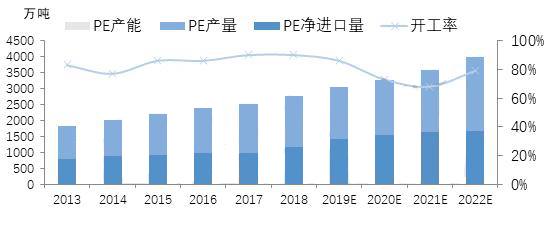 ????????PE國內(nèi)產(chǎn)能不斷擴(kuò)增的同時(shí),國際PE產(chǎn)能同樣快速增長,尤其近年來北美及中東地區(qū)以輕烴為原料的PE裝置快速投產(chǎn),我國是國際PE產(chǎn)品主要消費(fèi)國,國際PE產(chǎn)品的主要消費(fèi)目的地,導(dǎo)致我國PE進(jìn)口量仍保持快速增長。近年P(guān)E進(jìn)口依存度仍保持在50%左右。進(jìn)口PE產(chǎn)品依托其成本價(jià)格優(yōu)勢(shì),在國內(nèi)仍占有一席之地,預(yù)計(jì)PE進(jìn)口依存度下降緩慢。2019年國內(nèi)PE表觀需求量預(yù)計(jì)在3270萬噸左右,產(chǎn)量將達(dá)到1745萬噸,進(jìn)口量在1550萬噸左右,國內(nèi)PE進(jìn)口依存度約在49%左右。隨著國內(nèi)PE新增產(chǎn)能陸續(xù)釋放,預(yù)計(jì)2020-2022年國內(nèi)PE裝置開工率或有所下降。