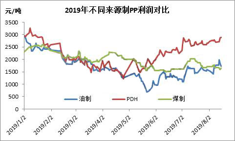 ????????此次東華能源計(jì)劃投產(chǎn)的裝置,繼續(xù)采用PDH工藝,為何近幾年來PDH裝置如雨后春筍般,蜂擁而至?首先從終端產(chǎn)品利潤(rùn)來看。以聚丙烯為例,2019年丙烷脫氫制聚丙烯平均利潤(rùn)在2000元/噸以上,下半年以來,因?yàn)楸閮r(jià)格震蕩下行,跌幅遠(yuǎn)大于聚丙烯價(jià)格跌幅,生產(chǎn)企業(yè)利潤(rùn)好轉(zhuǎn)。丙烷脫氫制聚丙烯利潤(rùn)明顯好于煤制和油制利潤(rùn)。