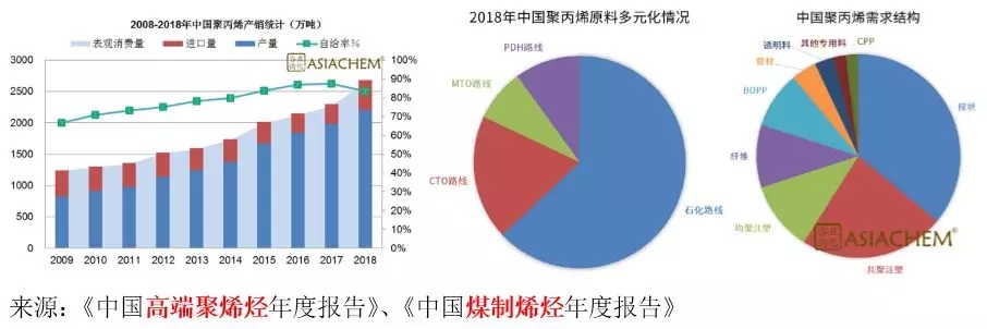????????聚丙烯(PP)是需求量最大的通用聚烯烴(PO)產品之一,在全球的消費量僅次于聚乙烯(PE)。中國是PP生產和消費大國。亞化咨詢數據顯示,截至2018年底中國已建成投產PP產能約2400萬噸/年,并且形成了石化、煤化工(CTO/MTO/MTP)、丙烷脫氫(PDH)等原料路線多元化發(fā)展的趨勢。中國PP需求量呈現穩(wěn)定增長,2018年表觀消費量約2600萬噸,供需缺口近400萬噸。中國PP主要消費領域是拉絲、注塑和纖維等,應用于包裝、電子、與家電、汽車、纖維、建筑管材等領域。