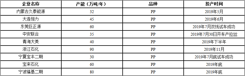 ????????1、2019年國內(nèi)PP裝置投產(chǎn)情況