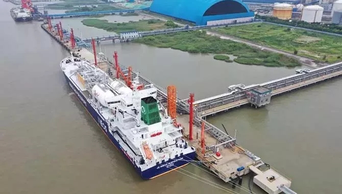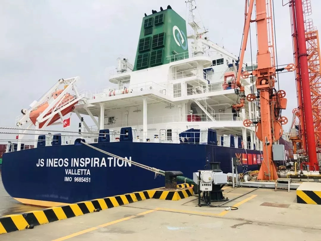 ????????8月7日13時(shí),乙烷運(yùn)輸船“英力士靈感號(hào)”靠泊泰興新浦2號(hào)碼頭。船上搭載的 1.5萬(wàn)噸進(jìn)口乙烷在經(jīng)過(guò)南京海關(guān)所屬泰州海關(guān)的現(xiàn)場(chǎng)查驗(yàn)后,順利開(kāi)卸,這也是國(guó)內(nèi)企業(yè)首次進(jìn)口乙烷產(chǎn)品