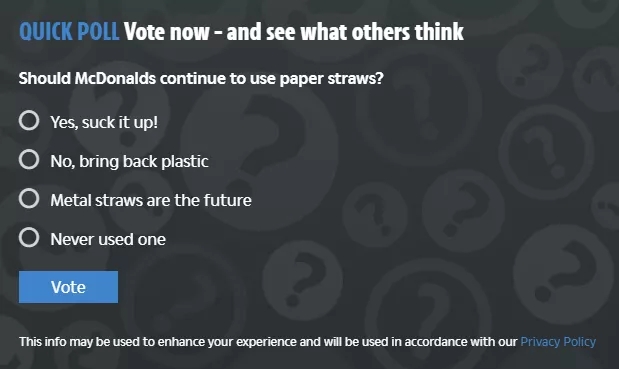 ????????時隔一年,伴隨著不少顧客對麥當(dāng)勞的抱怨——這類紙質(zhì)吸管并不好用,紙吸管質(zhì)地太軟,用起來一點(diǎn)都不如塑料吸管舒服。已經(jīng)有不少客戶希望麥當(dāng)勞用回原來的塑料吸管,截至8月8日,請?jiān)溉藬?shù)達(dá)到51000人。——麥當(dāng)勞不斷對吸管進(jìn)行改進(jìn),將吸管加厚再加厚。
