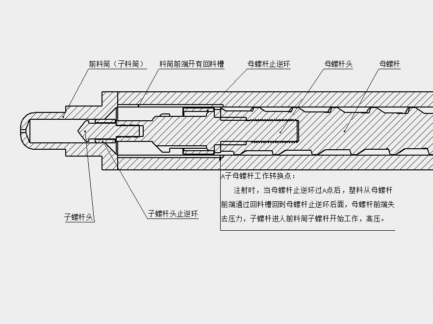 ????????本發(fā)明涉及一種子母螺桿注塑裝置。本發(fā)明由于在母螺桿頭上加裝了子螺桿,而位于母螺桿頭前端的子螺桿用于最后階段增加注射壓力和保壓壓力,能夠在大射膠量情況下同時得到高壓或超高注射壓力,大大提高產(chǎn)品品質,提高注射量,縮短加料和加工時間,提高生產(chǎn)效率,節(jié)約用電,減少螺桿料筒的磨損度。