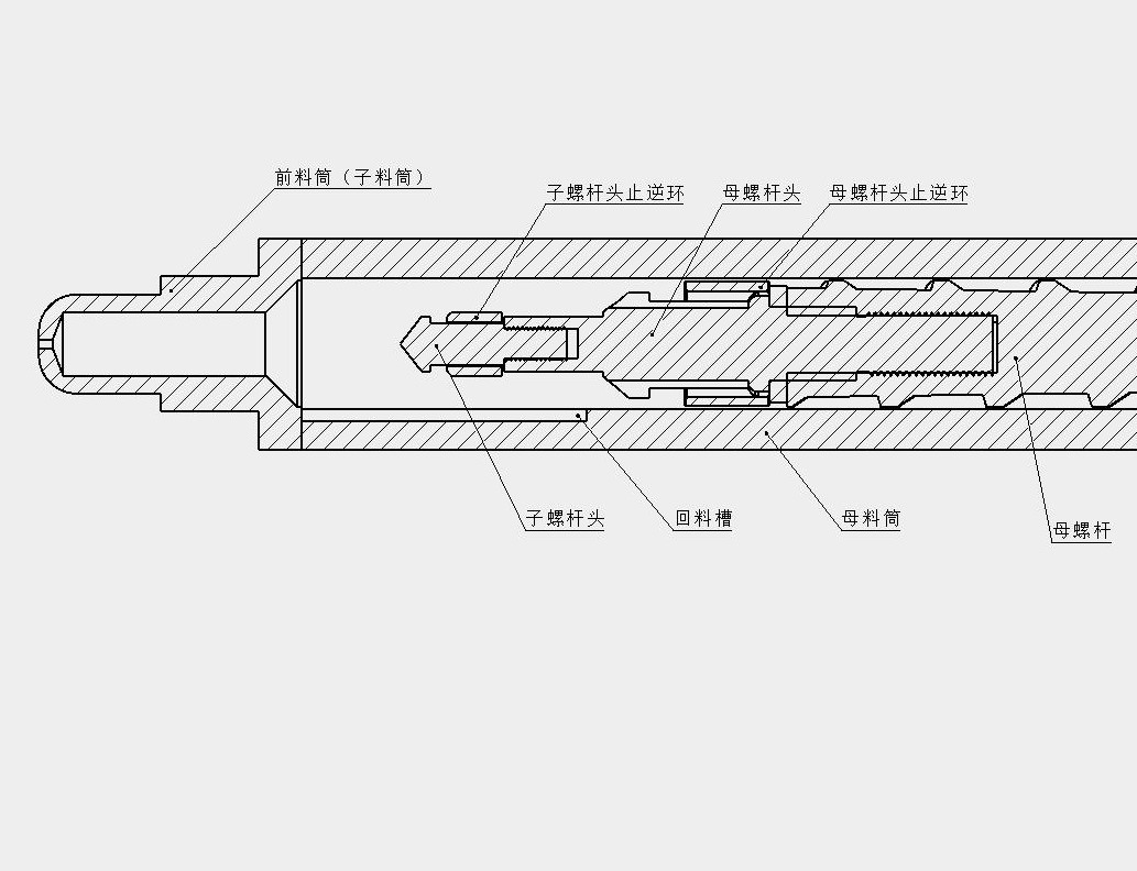 ????????6. 一些回料里面有很多雜質或加了碳酸鈣,螺桿料筒比較容易磨損,只要把母螺桿加大專門設計成加料塑化螺桿,把子螺桿設計成注射螺桿如圖7,會大大減少螺桿磨損