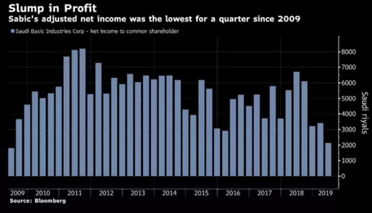 ????????由于對化學(xué)品和塑料的需求下降,沙特基礎(chǔ)工業(yè)公司(Saudi Basic Industries Corp.)第二季度利潤跌至2009年以來的最低水平,其股價下跌3.8%。