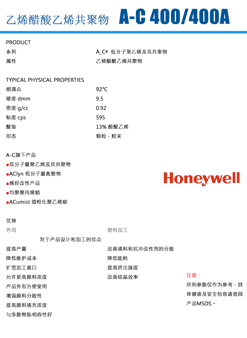 • 霍尼韋爾 honeywell EVA蠟 乙烯-醋酸乙烯共聚物蠟 AC-400A 顏料分散劑 物性表, 霍尼韋爾 honeywell EVA蠟 乙烯-醋酸乙烯共聚物蠟 AC-400A 顏料分散劑 產(chǎn)品參數(shù),霍尼韋爾 honeywell EVA蠟 乙烯-醋酸乙烯共聚物蠟 AC-400A 顏料分散劑 性能表,霍尼韋爾 honeywell EVA蠟 乙烯-醋酸乙烯共聚物蠟 AC-400A 顏料分散劑 出廠報(bào)告, MSDS,, 物質(zhì)安全資料表, UL黃卡,{ SGS報(bào)告, RoHS, 食品級(jí)認(rèn)證, NSF飲用水標(biāo)準(zhǔn), 產(chǎn)品資料, 產(chǎn)品性能, 出廠報(bào)告, 原廠原包, 代理商, 熱變形溫度, 熔指數(shù), 流動(dòng)系數(shù), 抗沖擊性能、沖擊強(qiáng)度, 低溫韌性、低溫抗沖擊性能, 熔體流動(dòng)系數(shù)、熔體流動(dòng)速率, 加工工藝、加工參數(shù)、加工溫度, 歐盟RoHS 德國(guó)FDA 美國(guó)FDA 日本FDA
