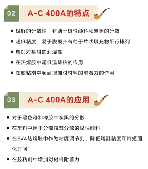 A-C 400A是一種乙烯-醋酸乙烯共聚物蠟,***適合用在需要分散碳黑的黑色母、難分散顏料的色母以及EVA色母中。