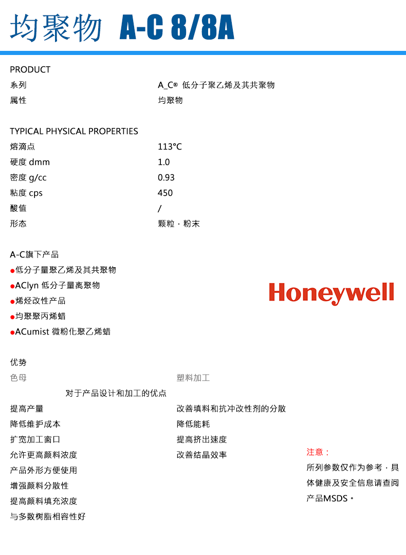 - Honeywell霍尼韋爾 A-C 8A 蠟粉 物性表, Honeywell霍尼韋爾 A-C 8A 蠟粉 產(chǎn)品參數(shù),Honeywell霍尼韋爾 A-C 8A 蠟粉 性能表,Honeywell霍尼韋爾 A-C 8A 蠟粉 出廠(chǎng)報(bào)告, MSDS,, 物質(zhì)安全資料表, UL黃卡,{ SGS報(bào)告, RoHS, 食品級(jí)認(rèn)證, NSF飲用水標(biāo)準(zhǔn), 產(chǎn)品資料, 產(chǎn)品性能, 出廠(chǎng)報(bào)告, 原廠(chǎng)原包, 代理商, 熱變形溫度, 熔指數(shù), 流動(dòng)系數(shù), 抗沖擊性能、沖擊強(qiáng)度, 低溫韌性、低溫抗沖擊性能, 熔體流動(dòng)系數(shù)、熔體流動(dòng)速率, 加工工藝、加工參數(shù)、加工溫度, 歐盟RoHS 德國(guó)FDA 美國(guó)FDA 日本FDA