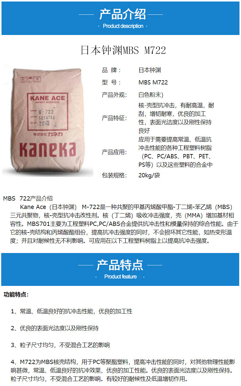 • MBS 722 PC增韌劑日本鐘淵 M-722粉末 PC/ABS抗沖擊改性劑 mbs722 物性表, MBS 722 PC增韌劑日本鐘淵 M-722粉末 PC/ABS抗沖擊改性劑 mbs722 產(chǎn)品參數(shù),MBS 722 PC增韌劑日本鐘淵 M-722粉末 PC/ABS抗沖擊改性劑 mbs722 性能表,MBS 722 PC增韌劑日本鐘淵 M-722粉末 PC/ABS抗沖擊改性劑 mbs722 出廠報告, MSDS,, 物質(zhì)安全資料表, UL黃卡,{ SGS報告, RoHS, 食品級認(rèn)證, NSF飲用水標(biāo)準(zhǔn), 產(chǎn)品資料, 產(chǎn)品性能, 出廠報告, 原廠原包, 代理商, 熱變形溫度, 熔指數(shù), 流動系數(shù), 抗沖擊性能、沖擊強(qiáng)度, 低溫韌性、低溫抗沖擊性能, 熔體流動系數(shù)、熔體流動速率, 加工工藝、加工參數(shù)、加工溫度, 歐盟RoHS 德國FDA 美國FDA 日本FDA