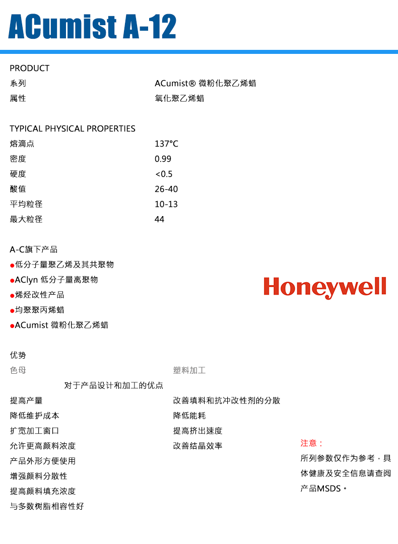 - 霍尼韋爾蠟粉 ACumist A-12 原裝進(jìn)口A12 物性表, 霍尼韋爾蠟粉 ACumist A-12 原裝進(jìn)口A12 產(chǎn)品參數(shù),霍尼韋爾蠟粉 ACumist A-12 原裝進(jìn)口A12 性能表,霍尼韋爾蠟粉 ACumist A-12 原裝進(jìn)口A12 出廠報(bào)告, MSDS,, 物質(zhì)安全資料表, UL黃卡,{ SGS報(bào)告, RoHS, 食品級(jí)認(rèn)證, NSF飲用水標(biāo)準(zhǔn), 產(chǎn)品資料, 產(chǎn)品性能, 出廠報(bào)告, 原廠原包, 代理商, 熱變形溫度, 熔指數(shù), 流動(dòng)系數(shù), 抗沖擊性能、沖擊強(qiáng)度, 低溫韌性、低溫抗沖擊性能, 熔體流動(dòng)系數(shù)、熔體流動(dòng)速率, 加工工藝、加工參數(shù)、加工溫度, 歐盟RoHS 德國FDA 美國FDA 日本FDA