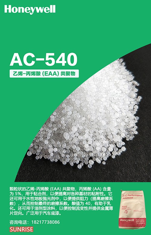 霍尼韋爾A-C 540A為粉末狀的乙烯-丙烯酸 (EAA) 共聚物,丙烯酸 (AA) 含量為 5%,用于粘合劑,以便提高對各種基材的粘附性?;裟犴f爾PE蠟A-C 540A還可用于水性地板拋光劑中,以便提供阻力(提高磨擦系數(shù))?;裟犴f爾PE蠟A-C 540A酸值為40,有助于乳化。還可用于溶劑型涂料,以便控制流變性并提供金屬薄片定向。廣泛用于汽車底漆?;裟犴f爾PE蠟A-C 540A還可用于色母粒和工程樹脂的分散劑。