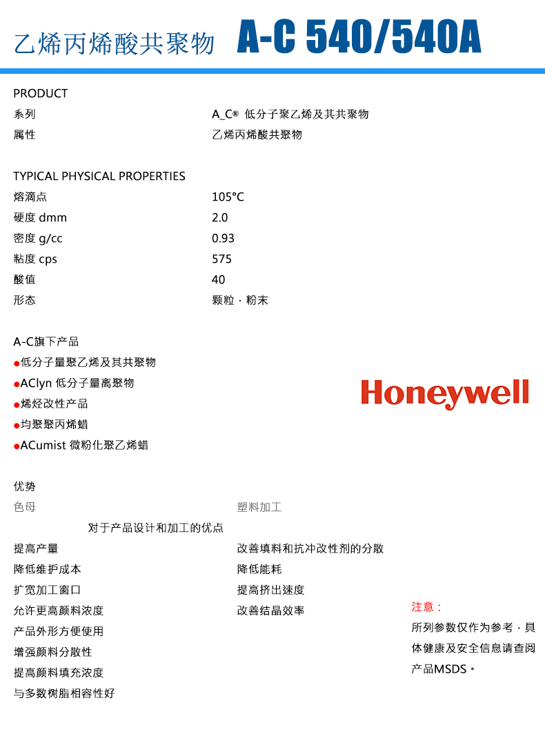 - Honeywell霍尼韋爾 A C 540 蠟粉蠟乳液 物性表, Honeywell霍尼韋爾 A C 540 蠟粉蠟乳液 產(chǎn)品參數(shù),Honeywell霍尼韋爾 A C 540 蠟粉蠟乳液 性能表,Honeywell霍尼韋爾 A C 540 蠟粉蠟乳液 出廠報告, MSDS,, 物質(zhì)安全資料表, UL黃卡,{ SGS報告, RoHS, 食品級認證, NSF飲用水標準, 產(chǎn)品資料, 產(chǎn)品性能, 出廠報告, 原廠原包, 代理商, 熱變形溫度, 熔指數(shù), 流動系數(shù), 抗沖擊性能、沖擊強度, 低溫韌性、低溫抗沖擊性能, 熔體流動系數(shù)、熔體流動速率, 加工工藝、加工參數(shù)、加工溫度, 歐盟RoHS 德國FDA 美國FDA 日本FDA