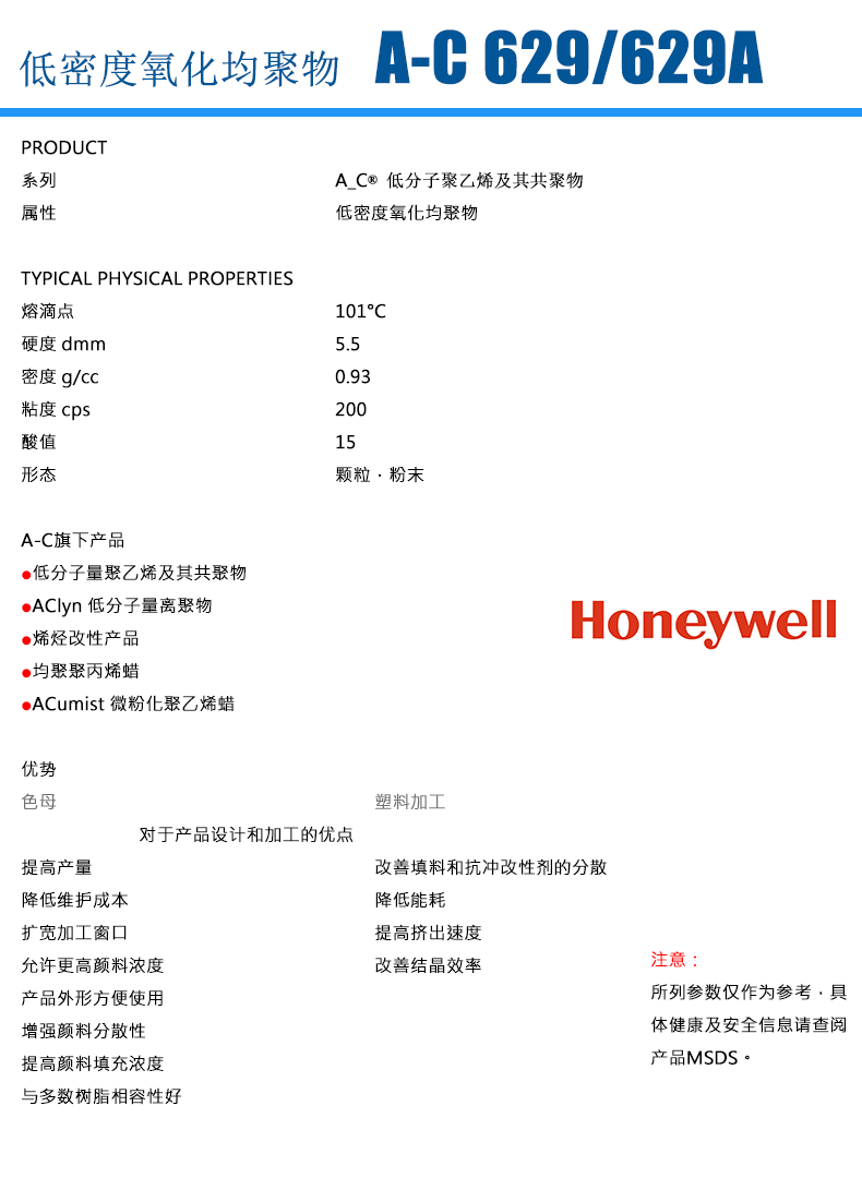- 美國霍尼韋爾 honeywell 氧化聚乙烯蠟 AC 629 物性表, 美國霍尼韋爾 honeywell 氧化聚乙烯蠟 AC 629 產(chǎn)品參數(shù),美國霍尼韋爾 honeywell 氧化聚乙烯蠟 AC 629 性能表,美國霍尼韋爾 honeywell 氧化聚乙烯蠟 AC 629 出廠報告, MSDS,, 物質(zhì)安全資料表, UL黃卡,{ SGS報告, RoHS, 食品級認證, NSF飲用水標準, 產(chǎn)品資料, 產(chǎn)品性能, 出廠報告, 原廠原包, 代理商, 熱變形溫度, 熔指數(shù), 流動系數(shù), 抗沖擊性能、沖擊強度, 低溫韌性、低溫抗沖擊性能, 熔體流動系數(shù)、熔體流動速率, 加工工藝、加工參數(shù)、加工溫度, 歐盟RoHS 德國FDA 美國FDA 日本FDA