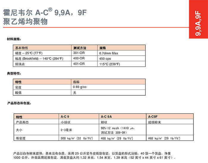 • 霍尼韋爾 AC® 9 低密度聚乙烯 (LDPE) 均聚物 物性表, 霍尼韋爾 AC® 9 低密度聚乙烯 (LDPE) 均聚物 產(chǎn)品參數(shù),霍尼韋爾 AC® 9 低密度聚乙烯 (LDPE) 均聚物 性能表,霍尼韋爾 AC® 9 低密度聚乙烯 (LDPE) 均聚物 出廠報告, MSDS,, 物質(zhì)安全資料表, UL黃卡,{ SGS報告, RoHS, 食品級認證, NSF飲用水標(biāo)準(zhǔn), 產(chǎn)品資料, 產(chǎn)品性能, 出廠報告, 原廠原包, 代理商, 熱變形溫度, 熔指數(shù), 流動系數(shù), 抗沖擊性能、沖擊強度, 低溫韌性、低溫抗沖擊性能, 熔體流動系數(shù)、熔體流動速率, 加工工藝、加工參數(shù)、加工溫度, 歐盟RoHS 德國FDA 美國FDA 日本FDA