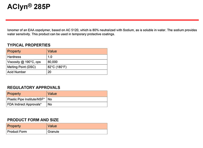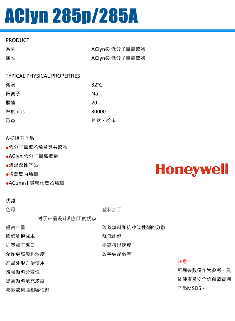 • 霍尼韋爾EAA離聚物蠟粉AClyn® 285P 結晶成核劑 物性表, 霍尼韋爾EAA離聚物蠟粉AClyn® 285P 結晶成核劑 產(chǎn)品參數(shù),霍尼韋爾EAA離聚物蠟粉AClyn® 285P 結晶成核劑 性能表,霍尼韋爾EAA離聚物蠟粉AClyn® 285P 結晶成核劑 出廠報告, MSDS,, 物質安全資料表, UL黃卡,{ SGS報告, RoHS, 食品級認證, NSF飲用水標準, 產(chǎn)品資料, 產(chǎn)品性能, 出廠報告, 原廠原包, 代理商, 熱變形溫度, 熔指數(shù), 流動系數(shù), 抗沖擊性能、沖擊強度, 低溫韌性、低溫抗沖擊性能, 熔體流動系數(shù)、熔體流動速率, 加工工藝、加工參數(shù)、加工溫度, 歐盟RoHS 德國FDA 美國FDA 日本FDA