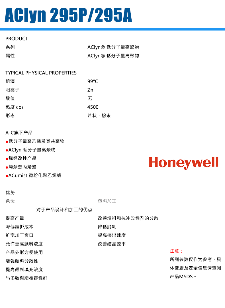 • Honeywell(霍尼韋爾) Acyln 295A低分子量離聚物 PBT尼龍成核劑 物性表, Honeywell(霍尼韋爾) Acyln 295A低分子量離聚物 PBT尼龍成核劑 產(chǎn)品參數(shù),Honeywell(霍尼韋爾) Acyln 295A低分子量離聚物 PBT尼龍成核劑 性能表,Honeywell(霍尼韋爾) Acyln 295A低分子量離聚物 PBT尼龍成核劑 出廠報(bào)告, MSDS,, 物質(zhì)安全資料表, UL黃卡,{ SGS報(bào)告, RoHS, 食品級(jí)認(rèn)證, NSF飲用水標(biāo)準(zhǔn), 產(chǎn)品資料, 產(chǎn)品性能, 出廠報(bào)告, 原廠原包, 代理商, 熱變形溫度, 熔指數(shù), 流動(dòng)系數(shù), 抗沖擊性能、沖擊強(qiáng)度, 低溫韌性、低溫抗沖擊性能, 熔體流動(dòng)系數(shù)、熔體流動(dòng)速率, 加工工藝、加工參數(shù)、加工溫度, 歐盟RoHS 德國(guó)FDA 美國(guó)FDA 日本FDA