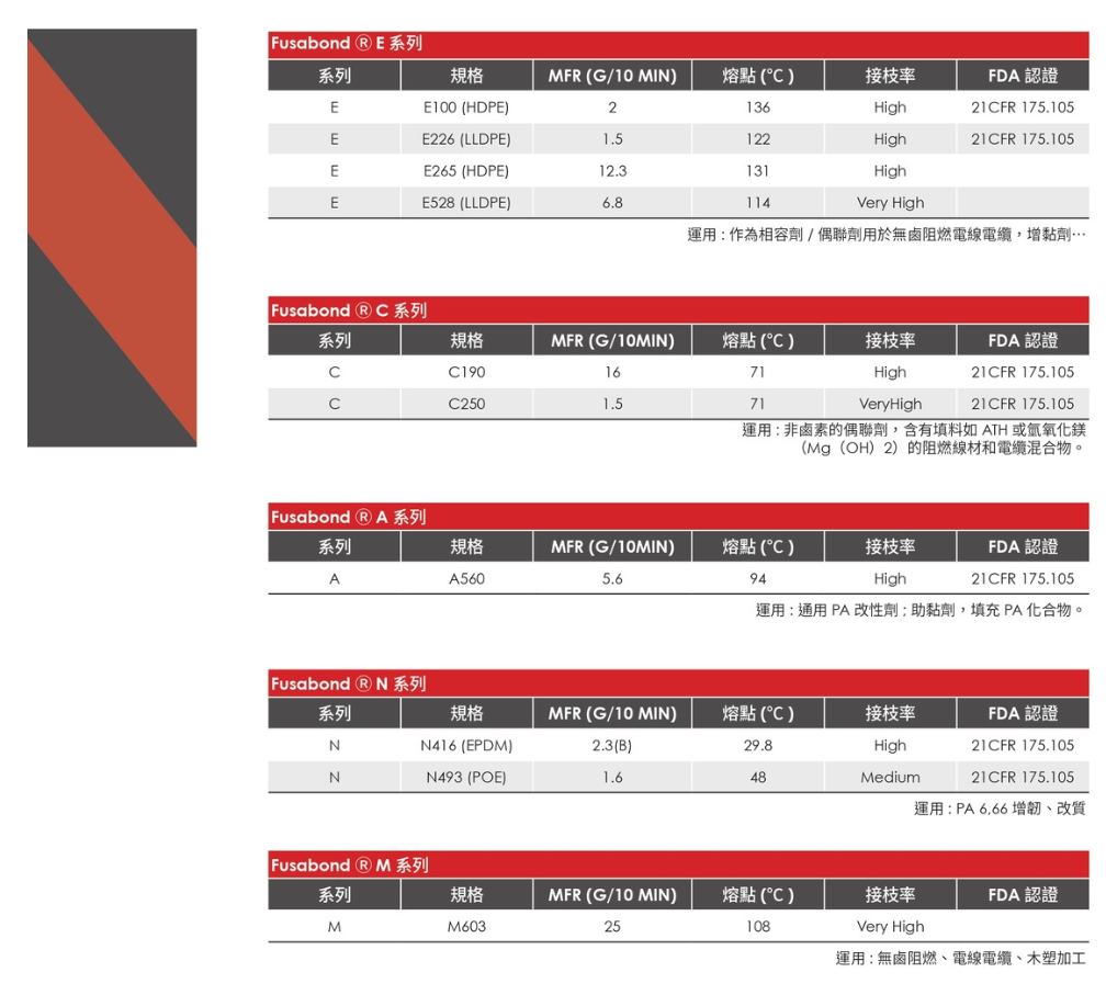 FUSABOND? 為陶氏 (Dow) 的功能性接枝聚合物系列,通常在聚烯烴或工程塑膠中引入 相容劑 / 接枝劑 的角色。其主鏈為 PE 或 PP,並在分子上接枝功能性基團(tuán)(如馬來酸酐 MAH),藉此改善與極性材料的相容性與黏著性。主要用於提升木塑複合材料 (WPC) 與 電線電纜 (W&C) 的性能。其基材為 乙烯-丙烯酸共聚物,再透過 無水馬來酸酐 (MAH) 接枝 技術(shù)製成。
