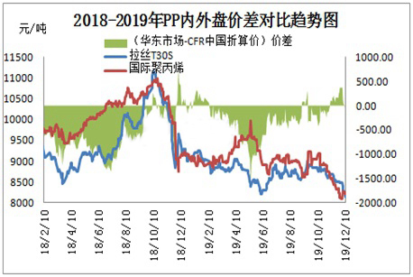 ????????由2019年P(guān)P內(nèi)外盤價(jià)差對(duì)比發(fā)現(xiàn),12月份市場(chǎng)內(nèi)外盤價(jià)格開(kāi)始逐步扭轉(zhuǎn)局勢(shì),主因目前國(guó)際聚丙烯裝置多套開(kāi)車并不順利,如馬來(lái)西亞石油公司裂解裝置問(wèn)題及俄羅斯西布爾裝置前期開(kāi)車均出現(xiàn)短期不順利現(xiàn)象,同時(shí)西方國(guó)家面臨新年節(jié)日,多數(shù)生產(chǎn)企業(yè)開(kāi)工負(fù)荷下降,導(dǎo)致國(guó)內(nèi)到港資源偏緊。而國(guó)內(nèi)市場(chǎng)因產(chǎn)能急劇上升及終端訂單跟進(jìn)乏力制約,國(guó)內(nèi)市場(chǎng)低價(jià)不斷頻現(xiàn),從而內(nèi)外盤價(jià)差逐步逆轉(zhuǎn)。