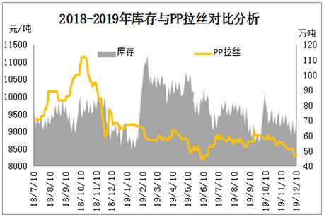 ????????2019年12月庫(kù)存顯示整體呈現(xiàn)震蕩下滑趨勢(shì),整體庫(kù)存維持在60-70萬(wàn)噸/年,但全球經(jīng)濟(jì)偏弱運(yùn)行及國(guó)內(nèi)實(shí)體企業(yè)訂單力度不及預(yù)期,市場(chǎng)原料消耗力度受到制約。同時(shí)2019年P(guān)P新一輪擴(kuò)能高峰期再次來(lái)臨,浙江石化及大連恒力等大型聚烯烴裝置落地試運(yùn)行,市場(chǎng)供需壓力更加凸顯,加快現(xiàn)貨市場(chǎng)拉絲下挫壓力。