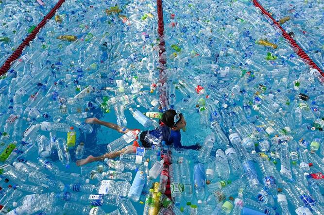 當?shù)貢r間2019年6月8日,泰國曼谷,民眾在裝滿塑料瓶的游泳池里游泳,以紀念世界海洋日,警醒塑料污染。 (視覺中國/圖)