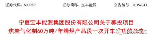 ????????公告顯示,焦炭氣化制60萬噸/年烯烴項目是寶豐能源首發(fā)上市募集資金投資項目,項目總投資金額達152.79億元。該項目主要分為兩段:前段焦炭氣化制220萬噸/年甲醇項目,后段甲醇制60萬噸/年聚烯烴項目,以及相關(guān)配套公用工程,預計將于2019年底前全部建成投產(chǎn)