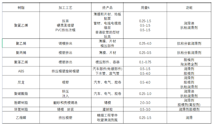在許多熱塑性和熱固性塑料中作為內(nèi)部和外部滑劑,最具代表者如 ABS、PS、AS、PVC,亦可應(yīng)用于PE、PP、PVAC、醋酸纖維素(cellulose,Acctate),尼龍(Nylon),酚醛樹脂(pheonolic-Resin)、氨基塑料等,具有良好的光潔度,脫膜性。