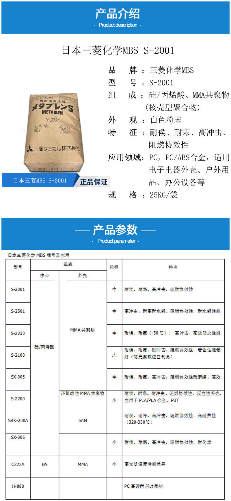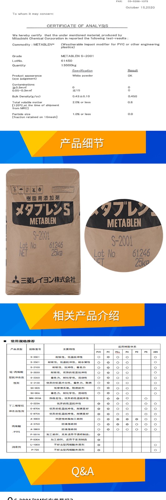 - 日本三菱S2001增韌劑 塑料改性 PC增韌耐候耐寒 麗陽MBS S-2001 物性表, 日本三菱S2001增韌劑 塑料改性 PC增韌耐候耐寒 麗陽MBS S-2001 產(chǎn)品參數(shù),日本三菱S2001增韌劑 塑料改性 PC增韌耐候耐寒 麗陽MBS S-2001 性能表,日本三菱S2001增韌劑 塑料改性 PC增韌耐候耐寒 麗陽MBS S-2001 出廠報告, MSDS,, 物質(zhì)安全資料表, UL黃卡,{ SGS報告, RoHS, 食品級認證, NSF飲用水標(biāo)準, 產(chǎn)品資料, 產(chǎn)品性能, 出廠報告, 原廠原包, 代理商, 熱變形溫度, 熔指數(shù), 流動系數(shù), 抗沖擊性能、沖擊強度, 低溫韌性、低溫抗沖擊性能, 熔體流動系數(shù)、熔體流動速率, 加工工藝、加工參數(shù)、加工溫度, 歐盟RoHS 德國FDA 美國FDA 日本FDA
