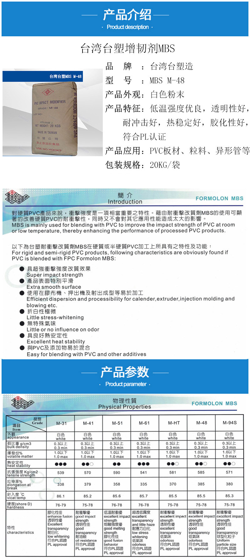 - 臺塑造MBS M48低溫強度好 透明MBS48 耐沖擊 PVC異形管增韌劑M-48 物性表, 臺塑造MBS M48低溫強度好 透明MBS48 耐沖擊 PVC異形管增韌劑M-48 產品參數,臺塑造MBS M48低溫強度好 透明MBS48 耐沖擊 PVC異形管增韌劑M-48 性能表,臺塑造MBS M48低溫強度好 透明MBS48 耐沖擊 PVC異形管增韌劑M-48 出廠報告, MSDS,, 物質安全資料表, UL黃卡,{ SGS報告, RoHS, 食品級認證, NSF飲用水標準, 產品資料, 產品性能, 出廠報告, 原廠原包, 代理商, 熱變形溫度, 熔指數, 流動系數, 抗沖擊性能、沖擊強度, 低溫韌性、低溫抗沖擊性能, 熔體流動系數、熔體流動速率, 加工工藝、加工參數、加工溫度, 歐盟RoHS 德國FDA 美國FDA 日本FDA