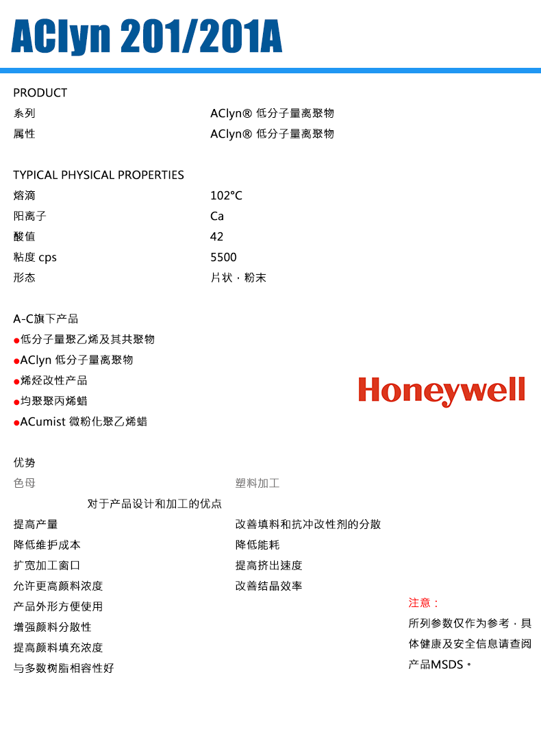 • 霍尼韋爾 AClyn® 201A EAA共聚物的鈣離子聚合物 物性表, 霍尼韋爾 AClyn® 201A EAA共聚物的鈣離子聚合物 產(chǎn)品參數(shù),霍尼韋爾 AClyn® 201A EAA共聚物的鈣離子聚合物 性能表,霍尼韋爾 AClyn® 201A EAA共聚物的鈣離子聚合物 出廠報告, MSDS,, 物質(zhì)安全資料表, UL黃卡,{ SGS報告, RoHS, 食品級認(rèn)證, NSF飲用水標(biāo)準(zhǔn), 產(chǎn)品資料, 產(chǎn)品性能, 出廠報告, 原廠原包, 代理商, 熱變形溫度, 熔指數(shù), 流動系數(shù), 抗沖擊性能、沖擊強(qiáng)度, 低溫韌性、低溫抗沖擊性能, 熔體流動系數(shù)、熔體流動速率, 加工工藝、加工參數(shù)、加工溫度, 歐盟RoHS 德國FDA 美國FDA 日本FDA