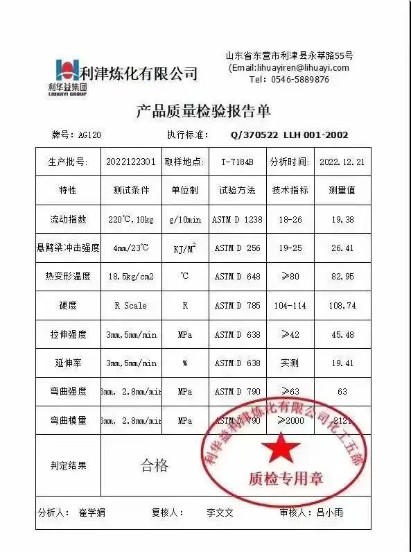 利華益利津煉化有限公司40萬(wàn)噸/年ABS塑料裝置于2022年底建成投產(chǎn)。公司采用了國(guó)際領(lǐng)先的乳液接枝-本體SAN摻混法ABS塑料等工藝技術(shù),利用企業(yè)自有苯乙烯、丙烯等原料進(jìn)行增鏈補(bǔ)鏈,生產(chǎn)高性能ABS塑料等產(chǎn)品,將打造國(guó)內(nèi)ABS產(chǎn)業(yè)鏈條中更完整、更先進(jìn)、更具競(jìng)爭(zhēng)力的“煉油—丙烯/乙苯—丙烯腈/苯乙烯—高性能ABS樹(shù)脂”全產(chǎn)業(yè)鏈條。公司熱銷(xiāo)產(chǎn)品AG-120價(jià)廉物美,流動(dòng)性和沖擊性良好。物性表如下: