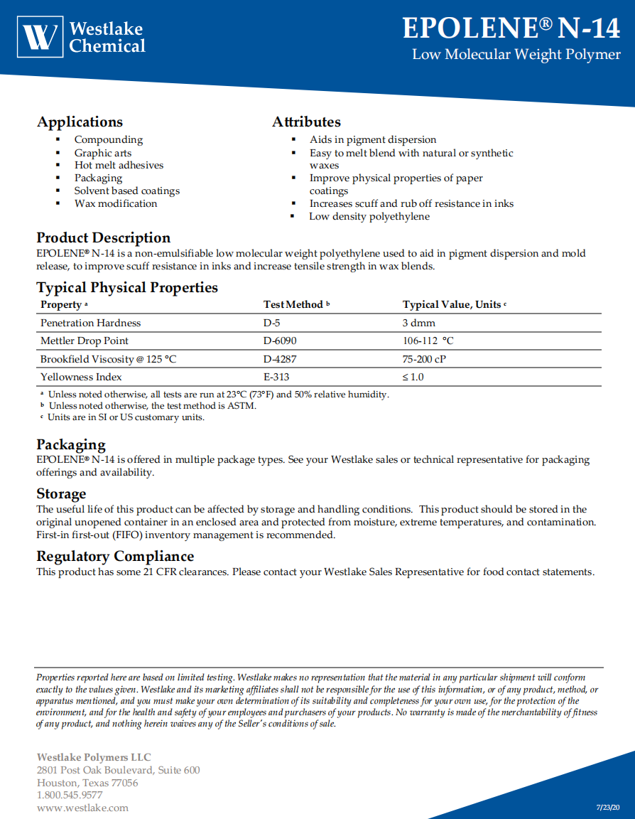 - 美國西湖化學WESTLAKEN14 聚乙烯蠟 N-14 物性表, 美國西湖化學WESTLAKEN14 聚乙烯蠟 N-14 產品參數(shù),美國西湖化學WESTLAKEN14 聚乙烯蠟 N-14 性能表,美國西湖化學WESTLAKEN14 聚乙烯蠟 N-14 出廠報告, MSDS,, 物質安全資料表, UL黃卡,{ SGS報告, RoHS, 食品級認證, NSF飲用水標準, 產品資料, 產品性能, 出廠報告, 原廠原包, 代理商, 熱變形溫度, 熔指數(shù), 流動系數(shù), 抗沖擊性能、沖擊強度, 低溫韌性、低溫抗沖擊性能, 熔體流動系數(shù)、熔體流動速率, 加工工藝、加工參數(shù)、加工溫度, 歐盟RoHS 德國FDA 美國FDA 日本FDA