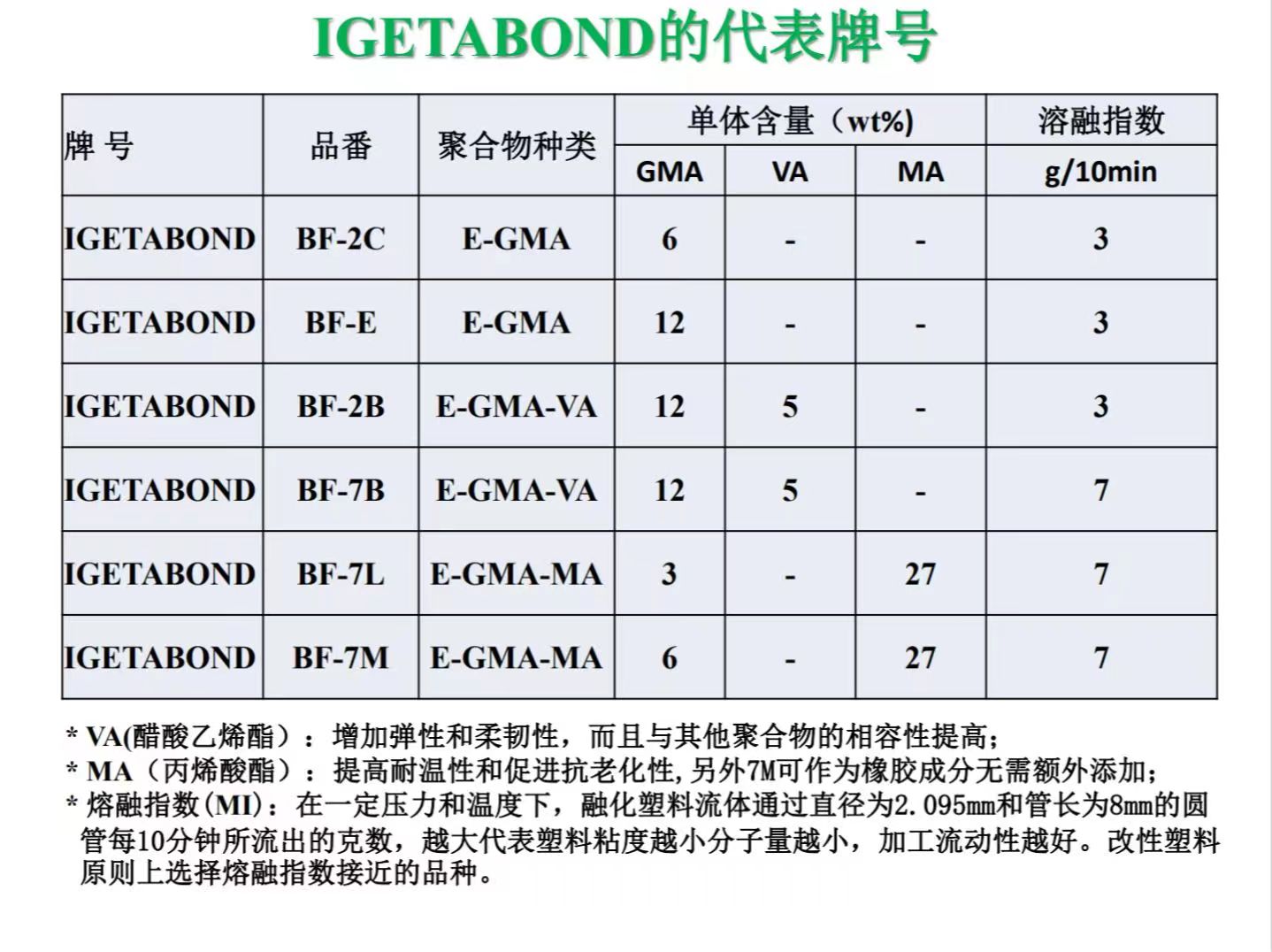 比如最有代表性的牌號(hào)BF-7M,可以直接用來添加3-5%來改善GF-PBT復(fù)合材料的抗沖擊性能。也可以直接用來代替目前市場上廣泛應(yīng)用的國外進(jìn)口改性劑。