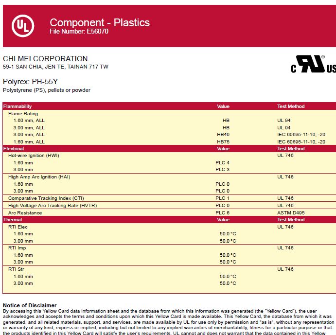 Min. Thick. 試片最小厚度 單位為mm。在上述黃卡中,試片厚度為3mm時(shí),難燃性為5VA。試片厚度為1mm時(shí),難燃性為5VB。